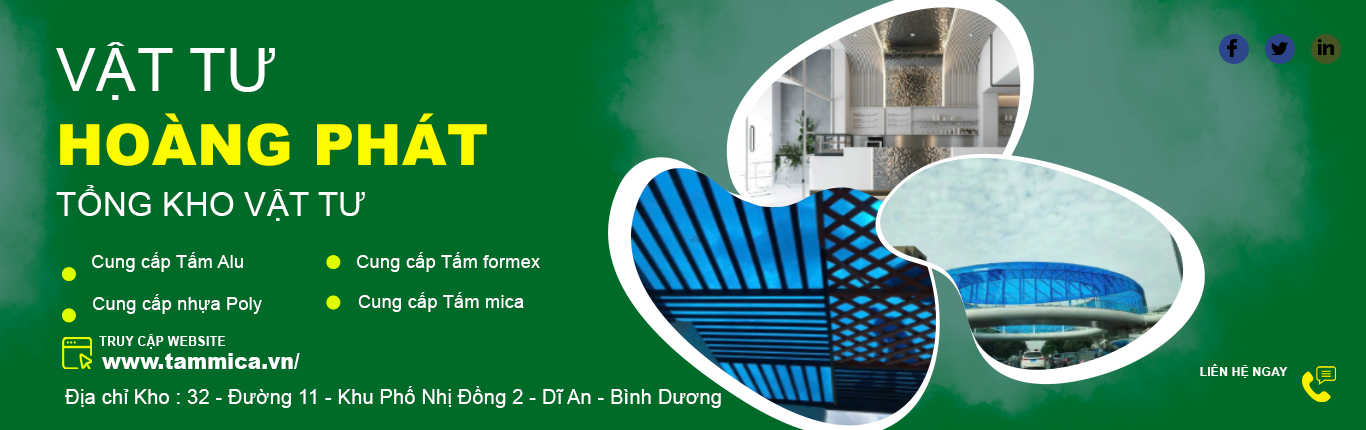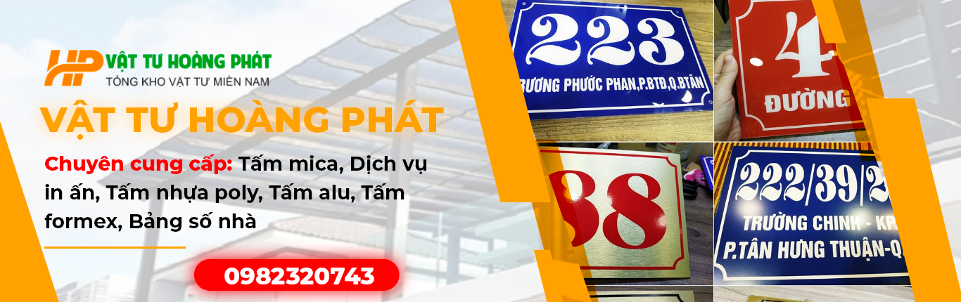 Vật Tư Hoàng Phát, tọa lạc tại 32- Đường 11 - Khu Phố Nhị Đồng 2 - Dĩ An - Bình Dương, là một đơn vị chuyên nghiệp trong lĩnh vực in ấn và quảng cáo. Vật Tư Hoàng Phát chuyên cung cấp các sản phẩm chất lượng cao như tấm nhựa mica, tấm alu, tấm fomex, bảng số nhà và nhiều loại in ấn phẩm khác.