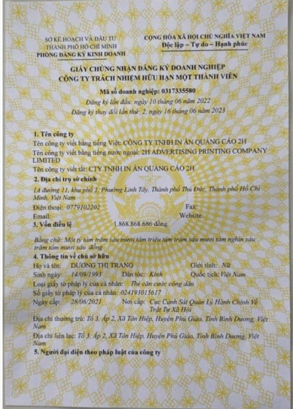 Giấy phép kinh doanh số 0317335580 của CÔNG TY TNHH IN ẤN QUẢNG CÁO 2H xác nhận rằng công ty đã đăng ký hoạt động hợp pháp theo quy định của pháp luật Việt Nam. Dưới đây là một số thông tin cơ bản về giấy phép kinh doanh:
